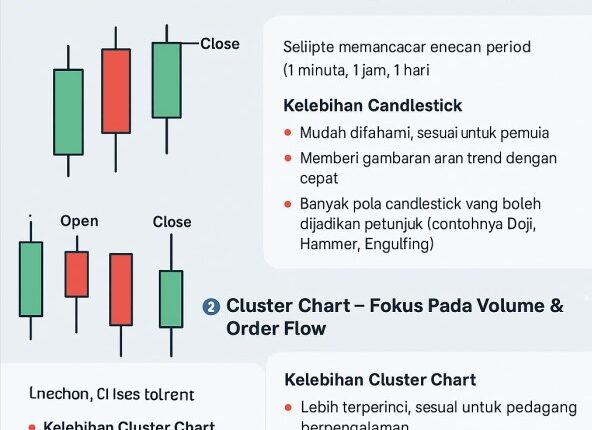 AA nak share tips! Dalam dunia dagangan dan analisis teknikal, graf harga memainkan peranan penting untuk membantu pedagang memahami pergerakan pasaran. Dua jenis carta yang sering menjadi perbincangan ialah Candlestick Chart dan Cluster Chart. Walaupun kedua-duanya digunakan untuk membaca pergerakan harga, cara penyampaian maklumat mereka adalah berbeza.