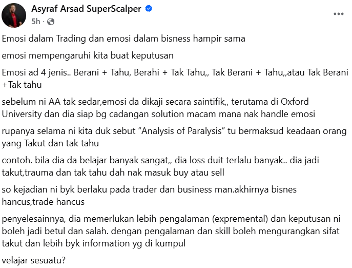 Menerusi perkongsian di Facebook, pakar teknikal analisis (TA), Asyraf Arsad berkata, ramai tidak sedar bahawa emosi sebenarnya telah lama dikaji secara saintifik, termasuk Universiti Oxford yang turut mencadangkan cara untuk menguruskan emosi dengan lebih baik.