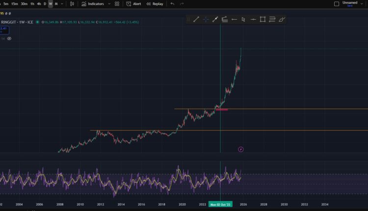 Pakar teknikal analisis (TA), Asyraf Arsad (AA) berkata, sejak tahun 2002, Ringgit Malaysia (MYR) menunjukkan trend penyusutan nilai berbanding emas, dan perkara ini jdapat dilihat melalui graf XAUMYR.